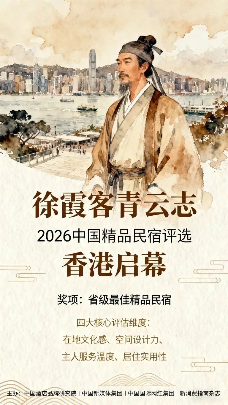 当徐霞客“探索天地”的旅行精神跨越六百年,与当代游客“寻在地温度、享个性栖居”的核心需求共振,一场重新定义精品民宿标准的行业盛会,近日在“亚洲文旅枢纽”香港正式启动。“徐霞客青云志——2026中国精品民宿评选”作为中国文旅卓越大奖核心板块,由中国酒店品牌研究院、中国新媒体集团、中国国际网红集团、新消费指南等四大权威机构联合主办、上海秀维文化传媒全程承办,11月15日至12月15日为评选周期,2026年1月初拟举办颁奖盛典,并创新增设“省级最佳精品民宿”席位,以“专业评审+住客口碑”双轮驱动,为千万游客筛选真正“精于品、暖于魂”的住宿标杆。